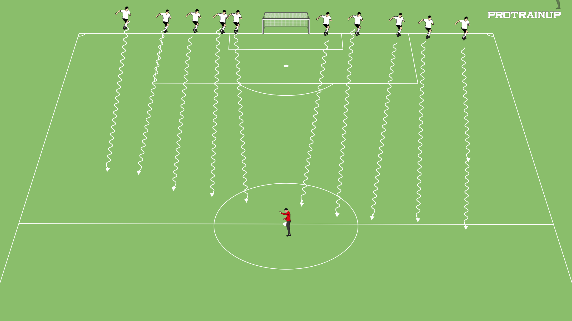 Prowadzenie piłki do wyznaczonego pola, na sygnał Trenera zawodnicy zatrzymują się. Sygnałem będzie np. uniesiony czerwony stożek, Po opuszczeniu stożka, zawodnicy wracają do gry.